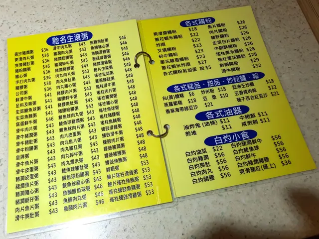 。餐牌黃底黑字,分類藍底白字,非常擔搶眼,而選擇非常之多,唔喺誇張,叫人睇得眼花撩亂,而且,佢哋唔止賣粥,仲有湯飯同粉麵供應,真喺一日3餐過嚟食都唔怕悶