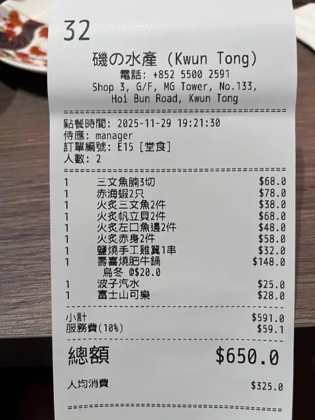 磯の水產 (Kwun Tong) Book online for up to 20% off and earn Rice Dollars URL: https://s.openrice.com/QrKS0PROB00 Add.: Shop 3, G/F, MG Tower, 133 Hoi Bun Road, Kwun Tong, Hong Kong Tel.: +852 55002591