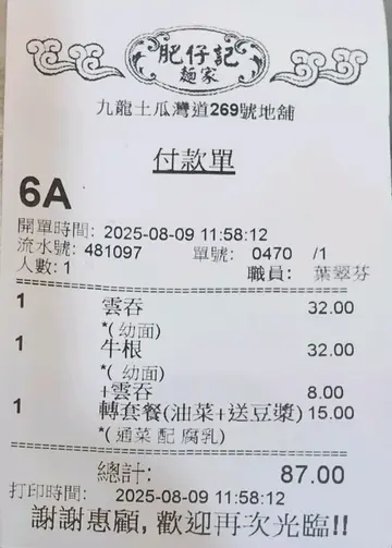 8月9日揾食肥華和靚媽,往土瓜灣食糖水前,因利乘便先到此間麵店,食碗傳統廣東麵食,打打個底先。今餐肥華喺柯打咗個,雲吞麵餐,内有一碗雲吞麵,一碟腐乳通菜及一杯凍荳䊢,講真此麵餐内三款食品,都非常味美,質量都對得住,顧客所付出嘅價錢。而靚媽點嗰碗,牛筯雲吞麵,亦喺高水準之作,由湯底到幼麵及牛筋和雲吞,都獲靚媽稱讚。本來今餐真喺,低食又好食,都冇乜可彈,但此店美中足喺,枱面上嘅調味醬料,竟然欠缺咗食廣東雲吞麵嘅最佳拍檔,個款橙色廣東辣椒醬,就喺令肥華對此店呢餐唯一不滿嘅評語,今餐值。⭐️⭐️⭐️⭐️⭐️…Read More