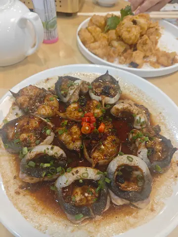 清蒸斑頭腩原條斑頭腩蒸到剛熟, 魚肉鮮甜, 肉質嫩滑, 口感滑順!魚油豐富, 鮮味十足~~豉油皇中蝦 $168用秘製豉油皇爆炒, 中蝦炒到金黃~蝦殼脆到可以連殼食, 蝦肉爽彈鮮甜, 非常惹味!!!蘿白清湯腩煲 $198牛腩炆到淋滑入味, 蘿白煮到透明, 索晒湯汁精華~~湯底清澈清甜, 整體味道平衡, 唔會太油膩