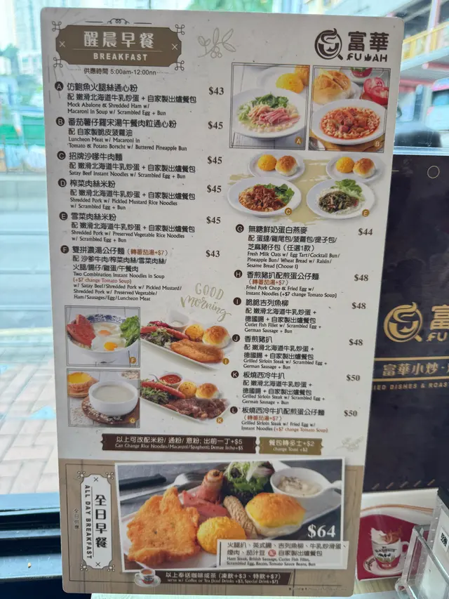富華冰室富華冰室在葵涌廣場佔有好好重要的地位因為周邊很多商業大廈從早上早餐至晚上的晚餐一直都是人頭湧湧,沒有間斷不足100米商場另一端還設有另一間分店相當誇張他與一般冰室不一樣香港以冰室命名的餐廳餐牌一般比較簡單款式亦不多而這間冰室的餐牌選擇非常多西餐牛扒,燒味,現場即焗麵包,即炒小菜應有盡有,難怪從早上忙到夜晚這次我吃的是午餐叉燒燒鵝還有半隻鹹蛋$73跟羅宋湯一碗(可選擇忌廉湯或是中湯)加上凍飲燒鵝皮脆肉嫩,燒鵝皮很脆,油分亦都很適中,不會太過多肥膏叉燒略為有點遜色,可能不是佢的招牌菜鹹蛋平時很少機會可以食到,因為知道不太健康但是久不久吃上一啖,那種鹹香感😋實在回味無窮最後想提及一下他的麵包他的菠蘿包很值得推介就算下午買夜晚才吃,他的表皮依然很脆菠蘿包就是要吃那種脆卜卜的表皮,很出色👍人均消費:$73好味:⭐️⭐️⭐️ ⭐️環境:⭐️⭐️⭐️ ⭐️性價比:⭐️⭐️⭐️ ⭐️#冰室 #茶餐廳 #富華 #出色菠蘿包 #葵涌廣場 #香港美食攻略 #香港 #香港一日遊 #香港美食 #香港食評 #真食評 #hkfoodblogger #foodblog #foodblogger#blogger #foodreview #hkfood #hkfoodie …查看更多