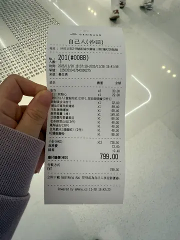 今餐兩個人食咗$598(連加一), 以呢個環境同食物質素來講, 算係合理~冰鎮咕嚕肉係最大亮點, 非常有驚喜!!其他菜式如水準之上~~喺沙田區食啲有特色嘅中菜同點心, 「自己人」係一個唔錯嘅選擇, 下次會再嚟試下其他菜式