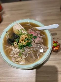 Hà Nội 越南菜今天在尖沙咀重慶大廈地庫河內越南菜用膳,嘗試咗一次美好的味覺之旅。*河內特色綜合河粉*這碗香氣四溢的綜合河粉是今日的第一道菜,份量好大,個湯底鮮甜牛骨嘅味道十足,生牛肉嫩滑,牛腩片軟嫩不膩,厚薄適中,牛味濃,扎肉彈牙,雞絲滑,香葉卷的加入為整碗湯粉增添了獨特的風味,肉卷上面用香葉包裹着,令人有齒頰生香的感覺。*越式炸蝦餅*每款粉麪飯都可以追加一款小食,看到餐牌上的炸蝦餅好靚,就叫咗一客,蝦餅外脆內嫩,蝦味十足,而且Q彈😋。*西貢法包拼盤*配料豐富,包皮香脆,有扎肉、青瓜、肉醬,把酸蘿蔔夾入個包內能提鮮,清新開胃;那兩根越式腸仔,咬落去肉味香濃,成個拼盤好有越南風味。*椰漿芒果糯米飯*椰漿、黑糯米飯配上鮮甜的芒果,絕對是驚喜!椰漿味十足,調教得好出色,夠濃郁,黑糯米有咬口,讓人回味無窮。即使不是芒果的季節,但係呢個芒果的質素也讓我驚喜,又新鮮又甜,實在值得一試。*越南滴漏咖啡*咖啡味道都算係濃郁芳香,容易入口,咖啡杯外型好靚,玻璃夠厚可以保暖,甜奶係分開上,唔飲甜嘢嗰啲客人都冇問題,幫襯任何粉麪飯用$18就可以追加👍。整體來講,河內越南菜不僅提供了多元化的出品,還有職員良好的服務態度,絕對值得再次光臨及試吓其他的菜式。…Read More