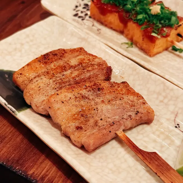 5️⃣ 黑豚腩塩燒串:肥瘦均勻,油脂甘香,灑七味粉辣勁過癮🌶️。