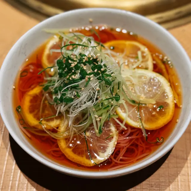 ▪️柚子梅素冷麵:凍蕎麥麵配柚子梅汁,酸甜清爽,可解膩。
