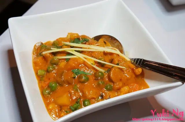 雜菜中包括有栗米,紅蘿蔔,青豆,薯仔,椰菜花,份量十足,不過這個咖喱醬汁明顯地辣了很多,而且是愈吃愈辣,要用牛油雞的醬汁來中和一下才可,不過用來點薄餅又的確很惹味的。