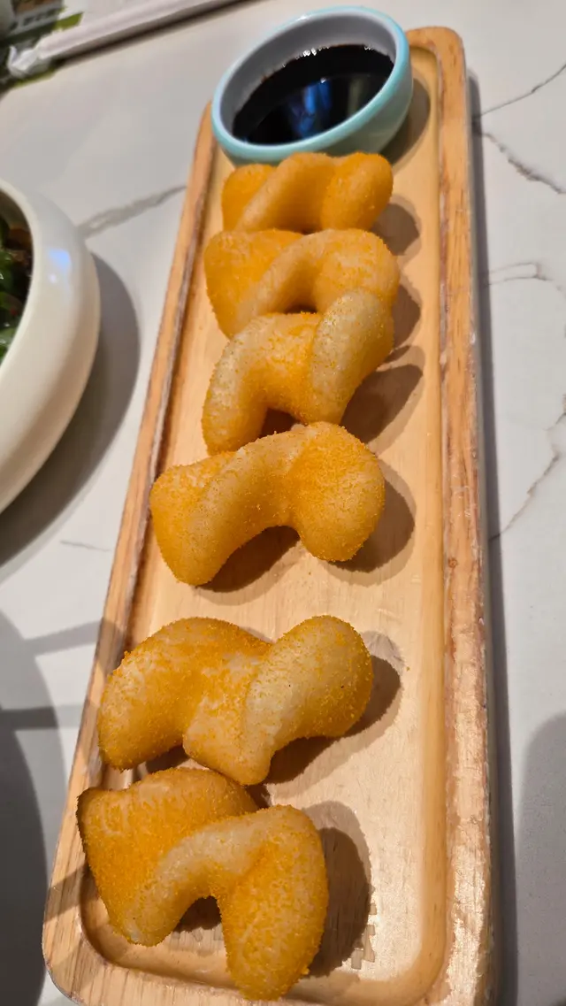 有別於一般的紅糖糍粑, 形狀系扭花型, 咬落鬆軟Q彈,點埋醬汁,特別香口,令人食完一件又一件。