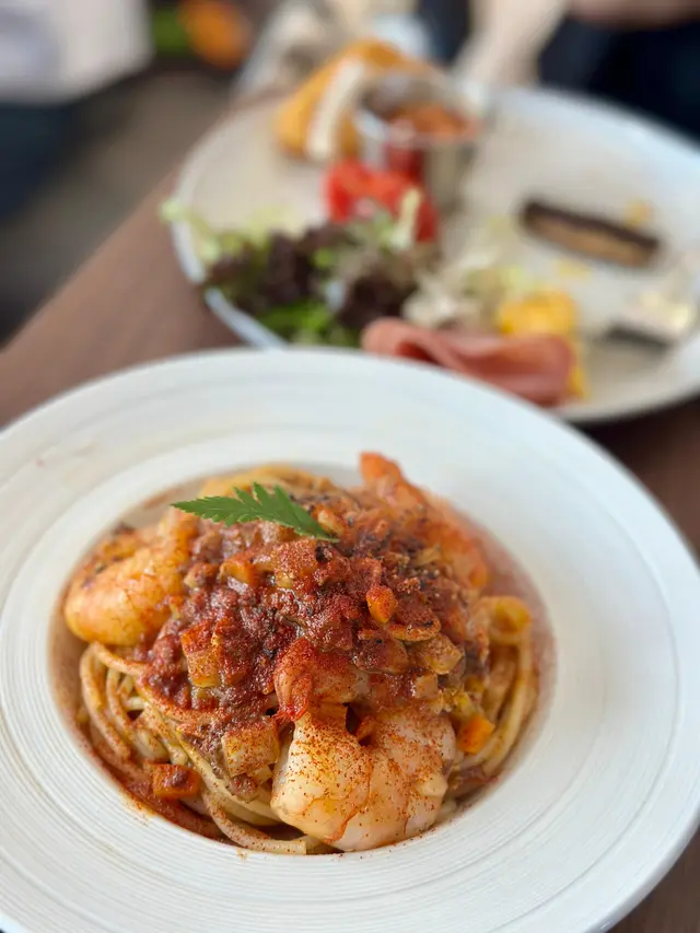有3大隻去殼去腸,超級爽彈!鮮茄辣肉醬都幾濃郁惹味,撈埋個意粉,食到後期都有點辣,唔錯。