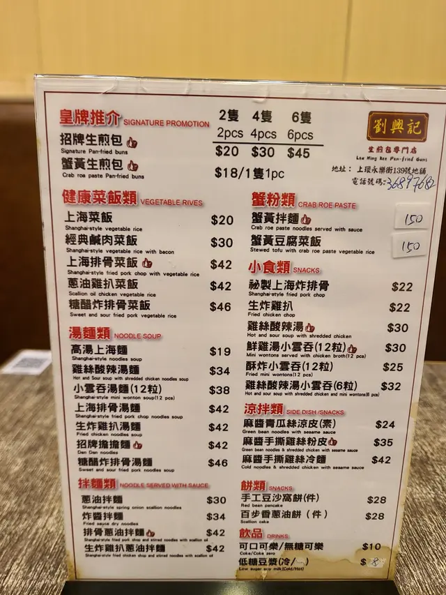 餐牌:皇牌推介、健康菜飯類、湯麵類、拌麵類、蟹粉類、小食類、涼拌類、餅類、飲品,都有人氣熱賣皇牌套餐。落單掃QR code。