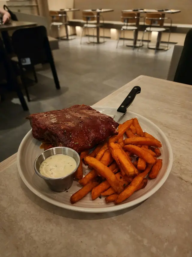 BBQ ribs BBQ sauce 甜酸剛剛好…ribs都煮得好夠時間…好容易就骨肉分離(好sad)。 呢個配左個炸蕃薯條…點刁草檸檬蛋黃醬好鬼夾…比點茄汁更夾