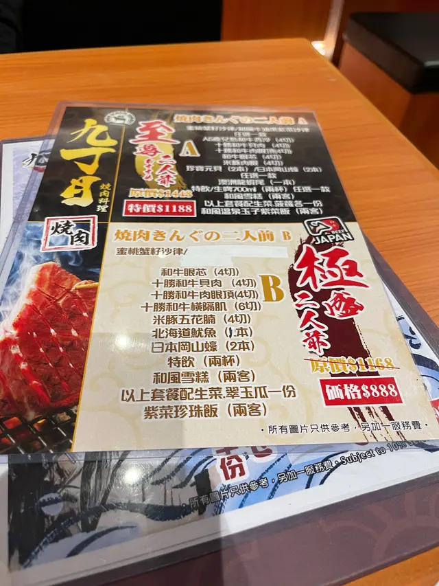 我們點了九丁目燒肉料理的極盛二人套餐,一共12道菜,都只是$888兩個人,非常抵食!
