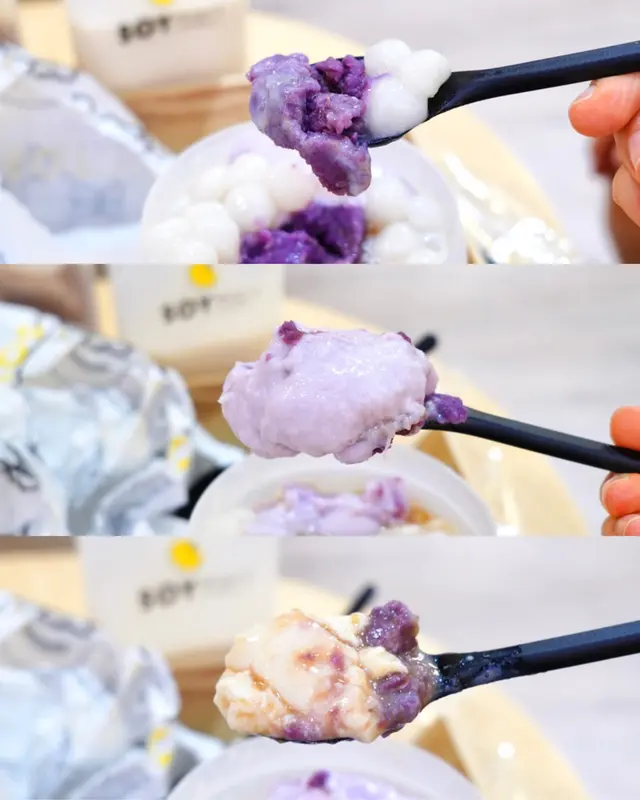 豆花底夾雜真紫薯蓉,面頭有好多粒粒小丸子同大大嚿淺紫色麻薯,好豐富!