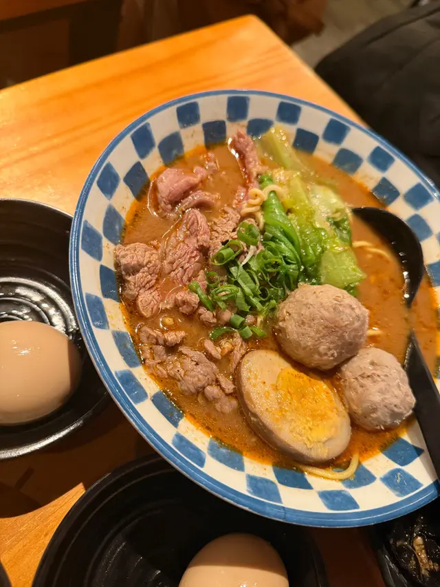 首先必試嘅係「沙嗲手切牛肉牛筋丸麵」。一上枱,個沙嗲湯底好濃郁,佢唔係得個鹹字,而係充滿層次感嘅香辣,仲帶住好濃郁嘅花生醬香,飲落順滑得嚟又唔會漿住個口。