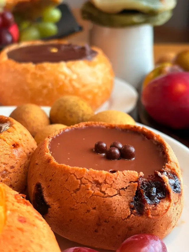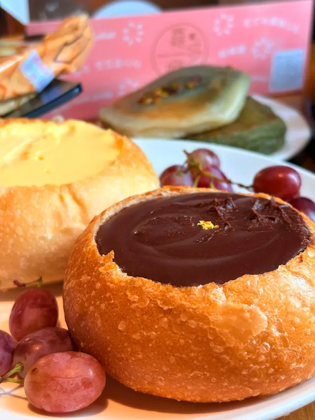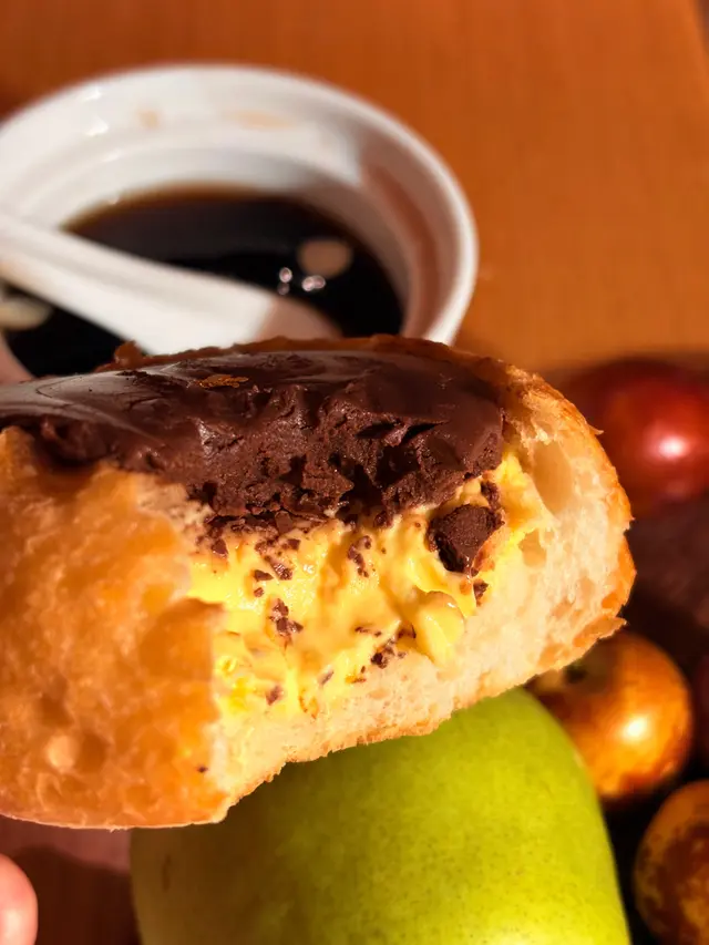 巧克力布丁包 在原味的基础上将半层改成了巧克力 咬一大口就是两种口味 苦甜交织 但还是有一点点腻😇