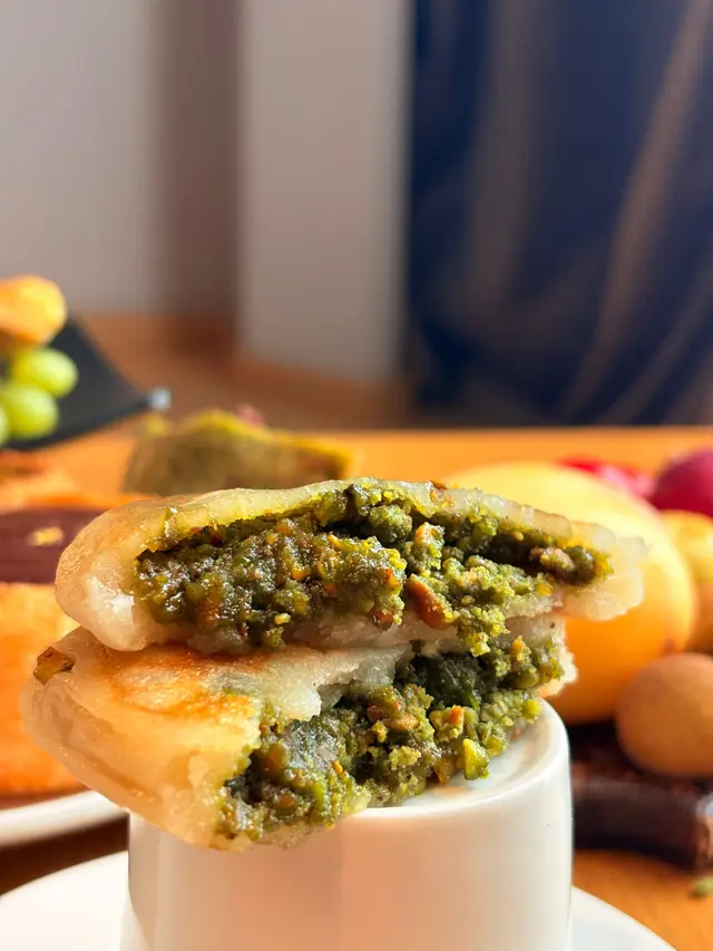 开心果烧饼 糯唧唧的外皮 也有些韧劲 包裹浓郁开心果馅与糖粒 能想象出的味道 吃起来获得更大的满足感
