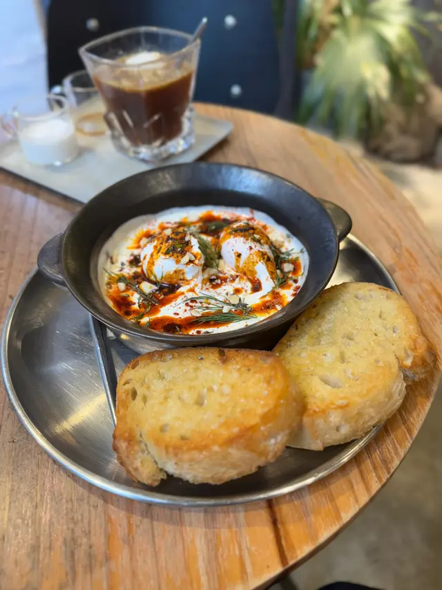 使用水波蛋,外層滑嫩,內裡流心,搭配自家製的香辣調味油,為口感增添層次,杏仁的脆感與調味希臘乳酪的酸香相互輝映,讓整體風味更加豐富,口感豐富,層次分明。