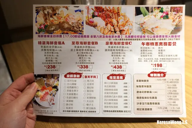 晚市有三款海鮮套餐, 每位價錢由HK$238起, 我地揀咗HK$338/位「至尊海鮮套餐B」, 店員告知套餐中所包含嘅刺身本由日本入口, 但目前已暫停入貨, 改以「壓力蠔」取代。