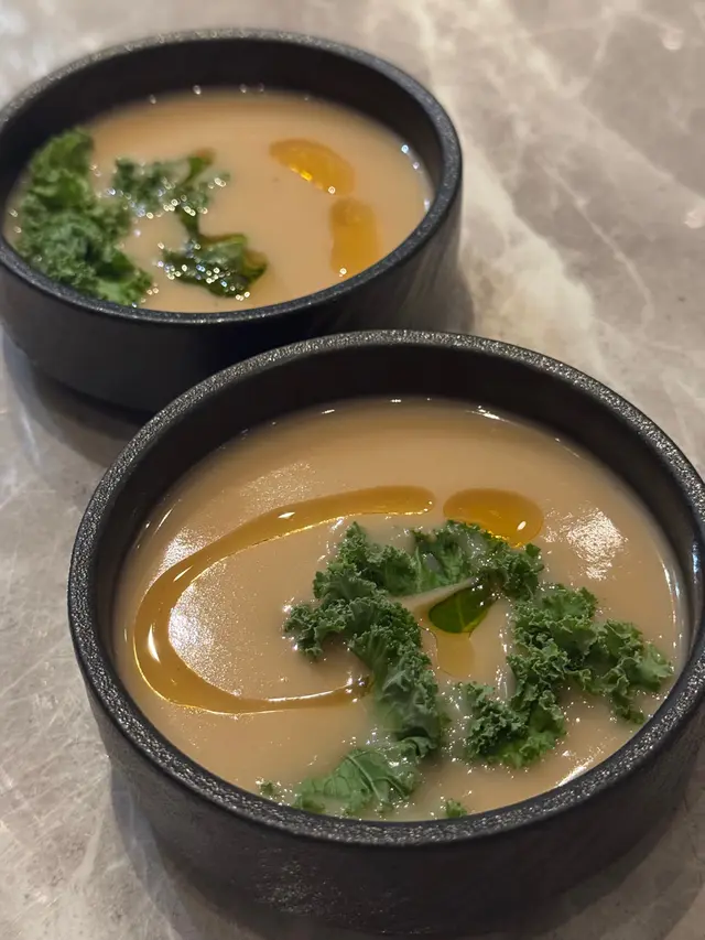 絕對唔係普通嘅法式洋蔥湯喎!呢個係一個充滿驚喜嘅洋蔥「薯仔」湯。湯底打得非常綿密順滑,每一啖都飲到洋蔥同薯仔嘅香甜。最精彩嘅係面頭嗰一羹蝦油,為成個湯注入咗靈魂!🦐 濃郁嘅蝦油鮮香同洋蔥嘅甜味互相輝映,加上羽衣甘藍,味道都好豐富。估唔到一個餐湯都可以咁有心思!💖