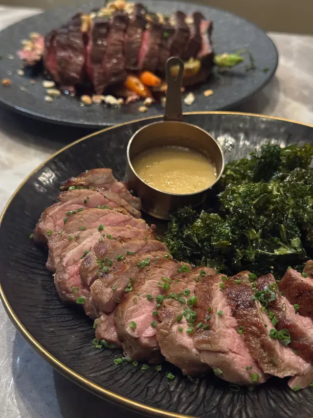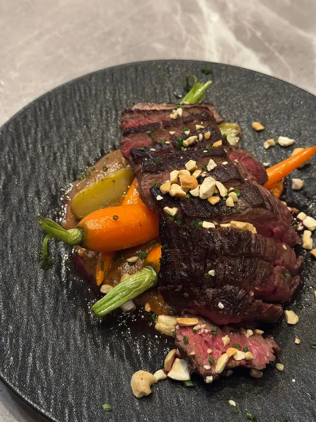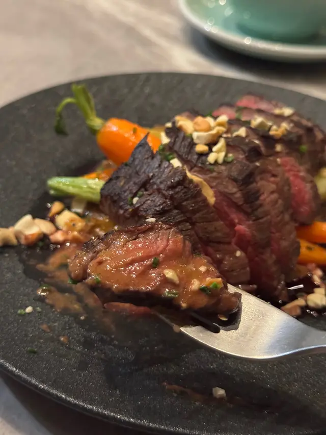 肉食獸嘅我,對呢道牛側腹肉十分滿意!M4級數嘅牛肉,肉質軟嫩得嚟帶有嚼勁,牛味濃郁。最特別嘅係,佢竟然配上沙嗲醬!🤯 呢個充滿東南亞風情嘅配搭,估唔到同牛扒出奇地夾!沙嗲醬嘅香濃花生味同微辣,不但冇搶走牛肉嘅風頭,反而激發出更多肉香,惹味到令人停唔到口!旁邊嘅雜菜亦都好好食,可以平衡返肉嘅油膩感。呢個Fusion玩得好成功!😍
