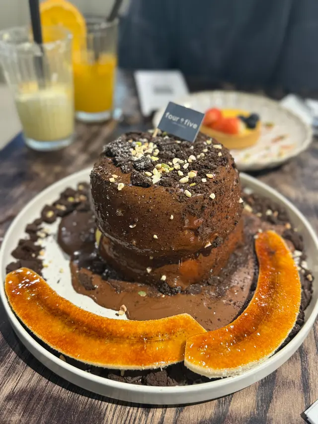 一上枱見到超大同聞到好濃嘅朱古力味🤣份量十足令人驚訝,疏乎厘嘅質感非常之鬆軟,成舊都duan下duan下😋入口有蛋香味配埋隔離嘅朱古力醬同埋Oreo碎就更加好食,本身就鍾意朱古力嘅朋友值得一試。旁邊仲有原條嘅香蕉切半配上焦糖,焦糖嘅味道啱啱好,唔會有燶味,食落都非常脆口,正~