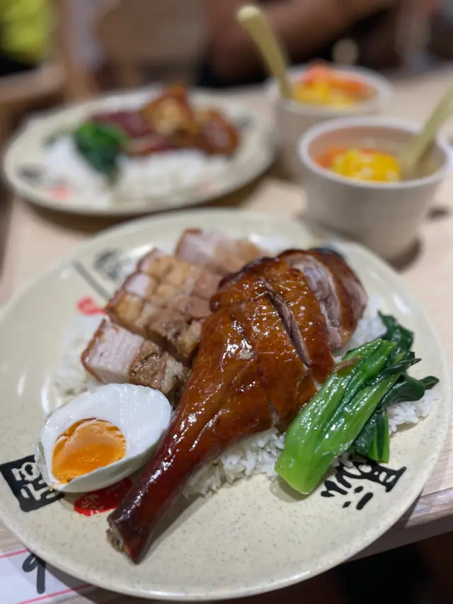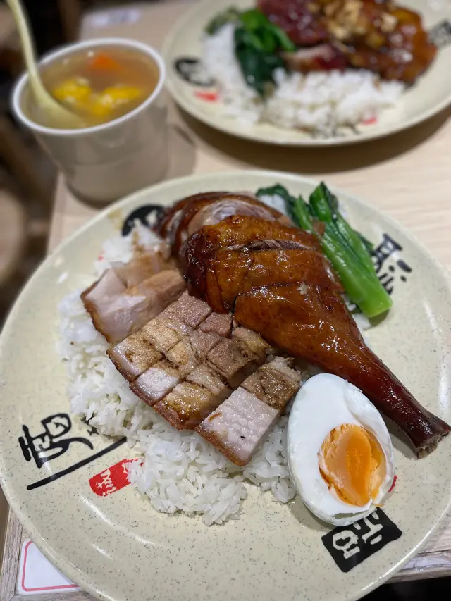 咁啱喺富榮花園附近做嘢,經過見到有間新開燒味舖,$53/1個碟頭飯,重點係:單/雙拼都同價!!!富榮花園不嬲都係美食沙漠,見有新嘢就走入去試吓啦~唔食都尤自可,食完真係:好好味啊!我同朋友一共叫咗兩碟雙拼飯,一碟係叉燒油雞,一碟係燒肉燒鵝髀。老細同老闆娘超好人!一入去坐低就送咗兩碗自家製靚湯,真係好飲,重點係足料,冇落味精(利申:小弟味精敏感)老細仲要每碟飯送多半隻鹹蛋,好耐冇試過鵝油鹹蛋撈飯,好滿足😮💨啲叉燒真係塊塊肥叉,入口即溶,燒肉每塊半肥瘦都唔再講,最緊要係個皮真係好脆。油雞個味好好食,唔係大家平時食到大家樂/太興嗰啲水平,好嫩好滑唔會過咸。燒鵝更加唔使講...肥而不膩,個皮仲要脆脆地😋我絕對夠膽講,真係唔差過國金軒叉燒個啲米芝蓮燒味👍除咗嘢食,仲要老闆佢哋一家人都好有人情味。同佢哋閑聊,兩個老闆原來喺各大燒味檔做阿頭都做咗好多年,兩兄弟一齊開舖。疫情後市道唔好,都想搞返旺個市,俾啲真正好食既燒味香港人食👍佢哋真係值得更多人認識。🫡…查看更多