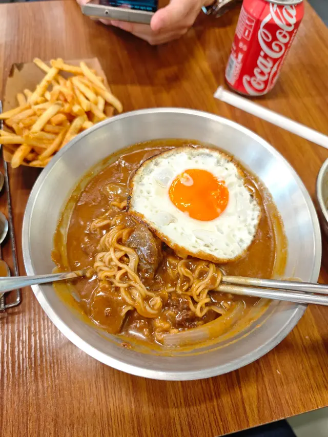 來到的時候只見有濃濃的湯覆蓋着,湯底還算香濃,可是牛比較韌,而且由於汁太濃令到成個面都好油膩,食咗一半食唔到落去。最正常的是薯條,正常,也有味粉架作調味。同行朋友點了黃金雞翼煎蛋飯