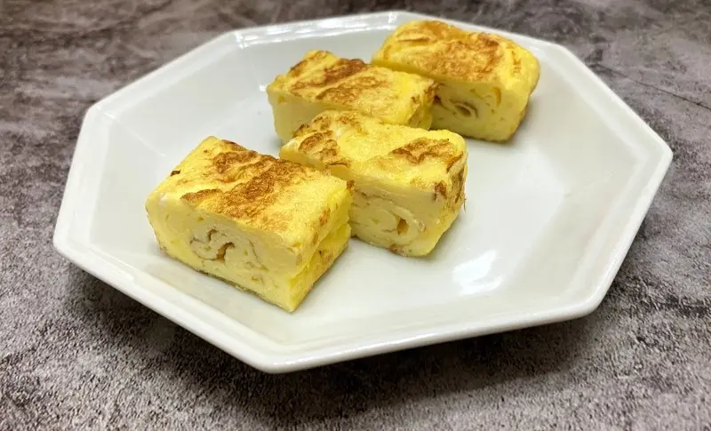 3. 於蛋卷鑊抹上一層油,開小火燒熱,倒入1/3蛋液,煎至開始凝固便捲起,推至鑊尾;再抹少許油,倒入1/3蛋液,重複以上做法,直至用完所有蛋液。最後轉中火把四面煎成喜歡的顏色,切件上碟。