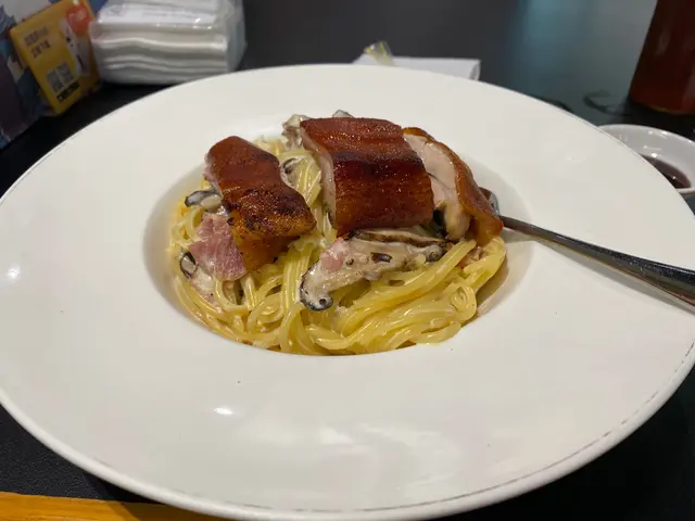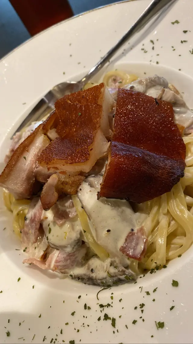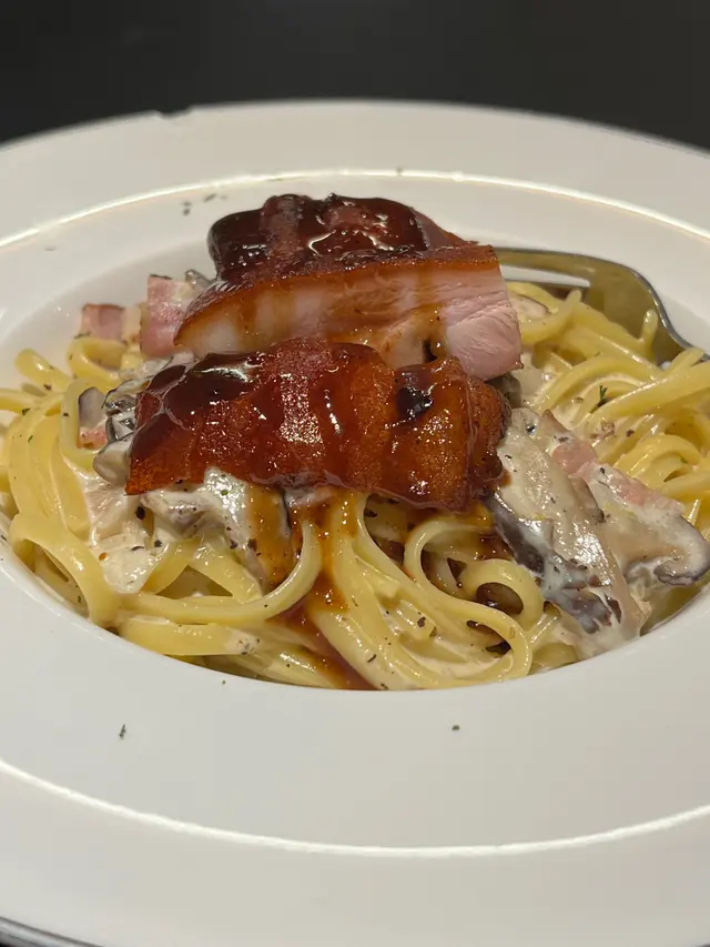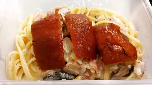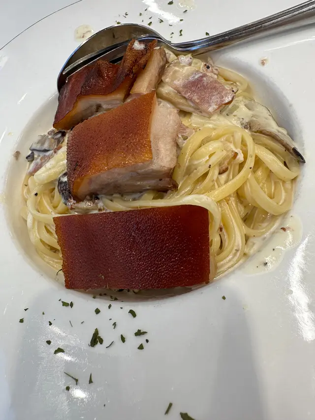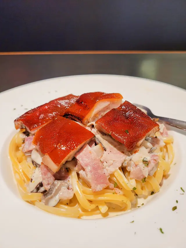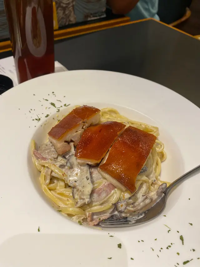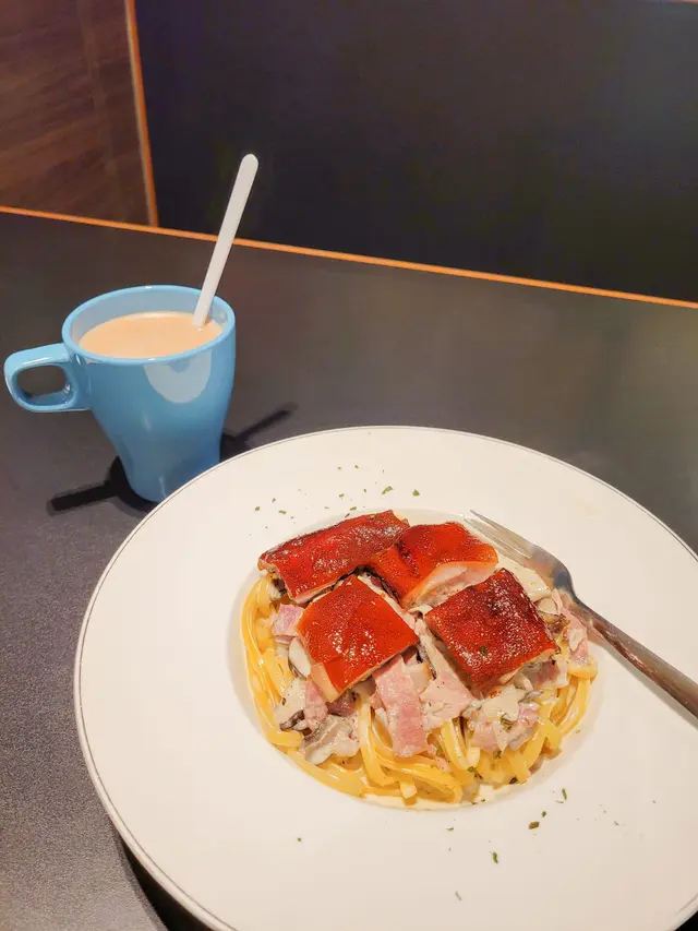 星期日去D2睇戲前來這裡食午飯,這裡不像一般茶餐廳,像快餐店多D,要在門口選購後入座。Order咗豉油雞飯及乳豬卡邦尼意粉,奶茶及凍檸茶。乳豬卡邦尼意粉:有少少失望,乳豬皮一D都唔脆似隔夜,只有三塊大小不一,像湊夠數就上碟,並不是原塊乳豬斬件上碟;不過扁意粉就煮得剛剛好掛汁,味道唔錯