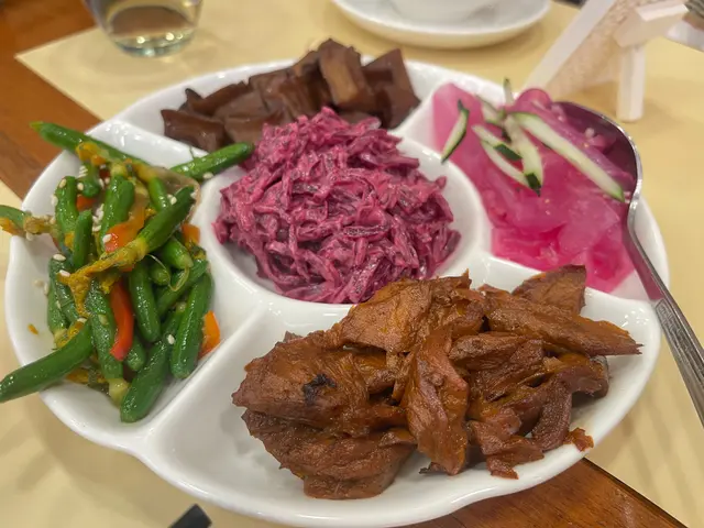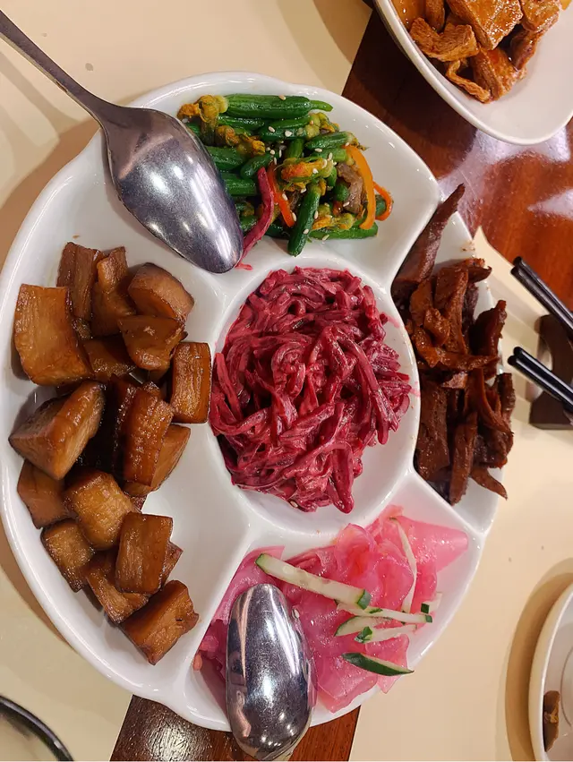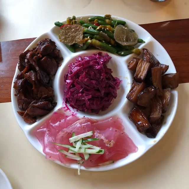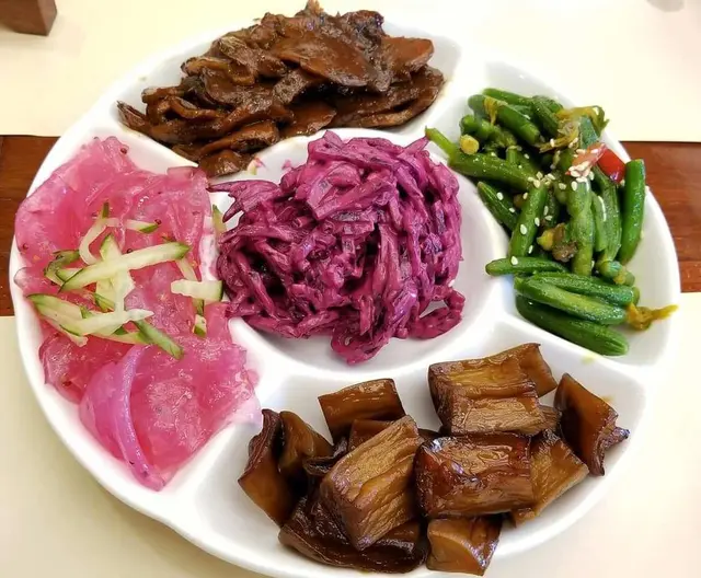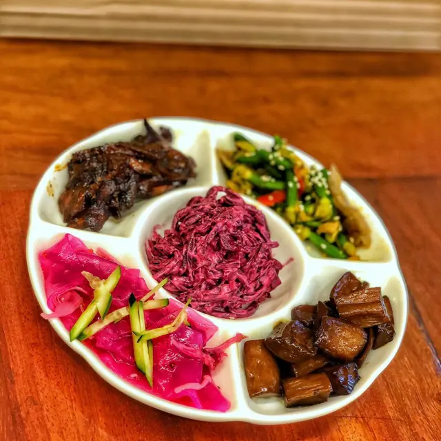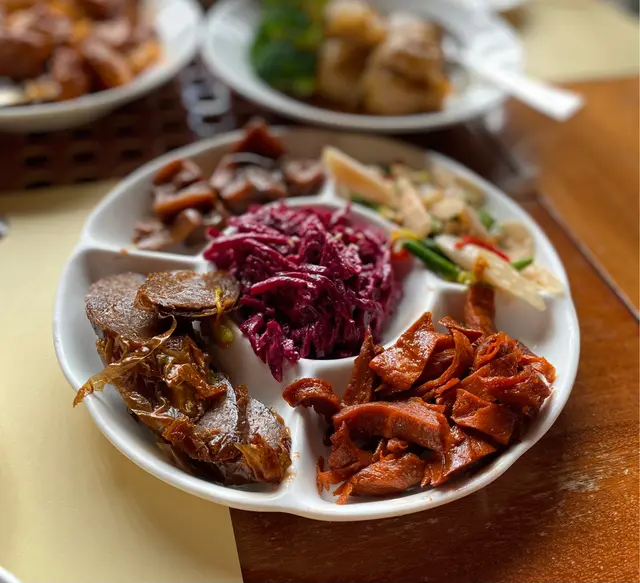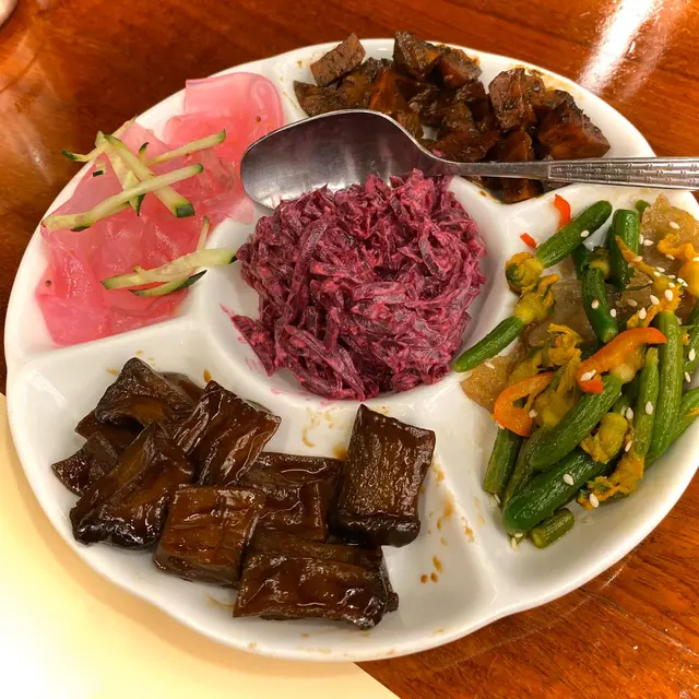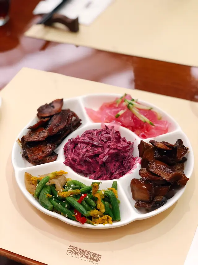 這裡的素食一向有質素,但經常爆滿,上次到此吃素正值疫情。如果閨蜜不預先訂位,大概今次也未必能到此用餐。館子雅緻潔淨,最可貴的是人多也不嘈吵。午市有套餐,比較划算,但單點的食物同樣吸引。因此點了一個午餐和一些心儀的素菜。五福拼盤中的五福包括紅菜頭沙律、醬燒菌、紫甘藍柚子醋粉皮、涼拌小青瓜(風味碧玉)及香麻海苔麵筋。五款小菜各有特色,非常可口,最喜歡的是酸甜的紅菜頭沙律和清新酸爽的醋粉皮。沒有查詢職員是日靚湯是什麼,因此不知是何靚湯?明顯的是,用料有很多果仁,令湯味很濃甜,可惜湯有點涼,減分不少。胡麻豆腐製作簡單,現成的豆腐腦加胡麻醬,沒有其他花巧,與我日常的操作相同。七彩金孢籽是以芹菜、芽菜、蟲草花、青紅椒和炸鮮竹炒製而成,各樣食材均算爽口但菜青味也濃重。赤膠花菜菌的主要材料是赤膠耳、麵筋和花菜菌,而花菜菌的英文是monkey-head mushroom即是猴頭菇。這個菜式非常美味,醬汁濃郁可口,赤膠耳更是膠質豐富,糯中帶爽,鳳眼果更為菜式添上果仁的口感和香氣。繡球菌形狀如一朵大花,是我很喜歡的食用菌其中之一,在其他素食店較少找到,這裡以胡椒及蘿蔔煮之,白蘿蔔的鮮甜和胡椒的辛香令味道偏淡的的繡球菌也別有一番風味。套餐的時果質素普通,但餐後有一點水果清清口腔也不錯。…查看更多