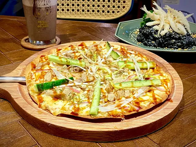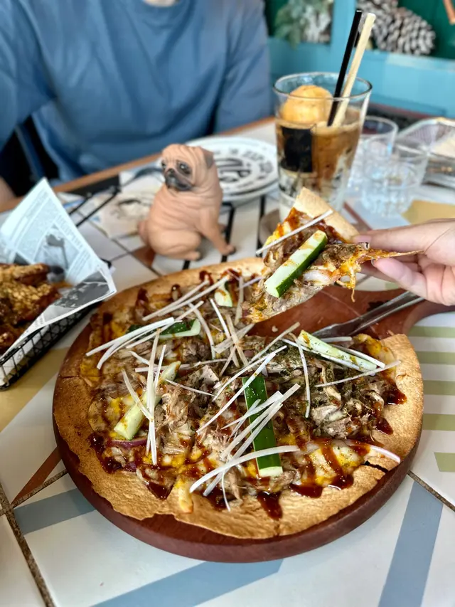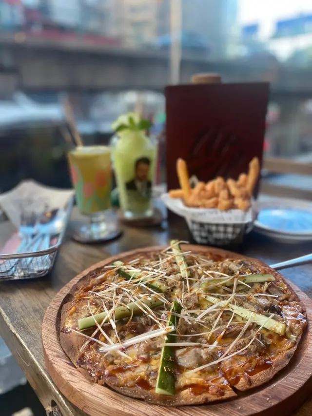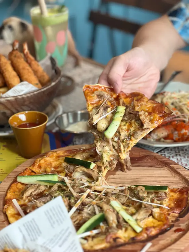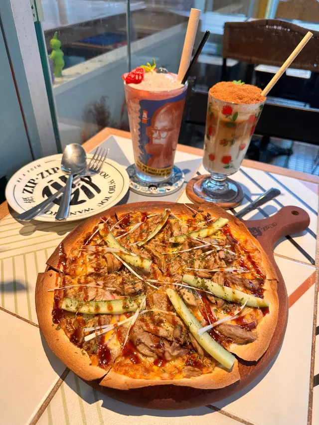 前身mamaday嘅ZipZip cafe,上到大廈1/F搵餐廳門口都撞板2次,係幾有趣嘅但走廊好窄好侷,無心情搵門口。入到餐廳,店面比想像中細小,裝飾品五顏六色變得壓迫感重,店內空氣好侷促又悶熱,好似無冷氣咁🥵另外,唔知點解要掃QRcode做咗會員先可以用餐。餐廳員工親切友善,有活力🫶🏻意外發現係pet friendly restaurant?用餐期間都聽到有狗吠、走咗過嚟呢邊。點餐環節,打開menu眼花凌亂,菜名奇怪又長氣,見住啲名真係完全唔覺得吸引,揀唔落手。最後主食都叫咗「黃金龍蝦汁魷魚薄片掛晒啲汁意粉」+「以為食緊片皮鴨比薩」,見線上好多人都推薦過,而飲品就叫咗「提拉米蘇聽過米」+「法式焦糖咖啡」,提拉米蘇都見有人推薦就trytry。每道菜式嘅份量都偏小。先講講碟pasta,魷魚幾fresh又彈牙,調汁味道十分好,食落有咸香,意粉彈牙,但唯一瑕疵就係掛汁唔夠,稍微偏乾,不過都真心推薦大家order呢款意粉👍食食吓就唔經唔覺清晒!😋pizza味道都唔錯,餅皮簿而香脆,2-3個人分享剛剛好,但餡料過分簡單又少,每塊pizza得1條青瓜、1小舊鴨肉、數條洋蔥絲,鴨肉肉質偏乾難咬,成日攝牙🥲飲品就比較推薦法式焦糖咖啡,有驚喜✨本身自己飲開咖啡少揀糖漿類,呢杯似係飲品又似係甜品,一啖飲落去有3層口感,caramel 焦香味、cream cheese 、latte,口感豐富,必推!👍對於杯提拉米蘇就真係好失望,cheese味勁淡,零咖啡酒味,但上蓋就有一層好厚嘅coco powder,你會發現佢只係一杯可可粉浮面嘅普通牛奶。…查看更多