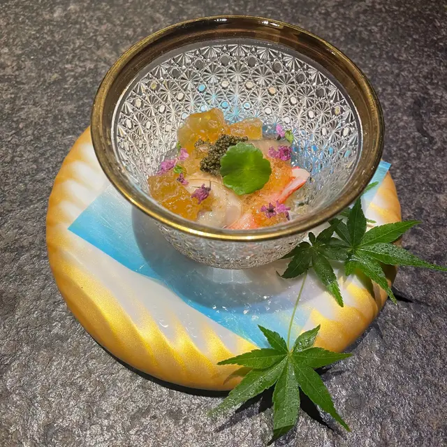 ☼ ☪︎ 先付由鮑魚、大蝦(本人因對蝦子敏感而轉成蟹腳🦀)、秋葵、車厘茄、紫蘇葉和鮑魚汁製成的啫喱組成的先付冰涼涼的很適合作開胃菜🧊☼ 刺身三款 / ☪︎ 刺身五款☼ 真鯛配海膽、柚子酸汁第一款刺身先由視覺的享受開始💫新鮮魚肉配上紫蘇花和柚子酸汁又是另一番滋味🍊☪︎ 真鯛、甜蝦蝦肉由真鯛魚肉卷著甜蝦蝦肉再注入液態氮及食用肥皂泡而製成的巨型泡泡賣相十分精緻!!🫧☼ 象拔蚌添加柚子皮和青檸汁的象拔蚌更為清新🍋☪︎ 北海道昆布森生蠔 生蠔非常飽滿 口感較為爽口🦪一口吃掉整份令人非常滿足🥰☼ 煙燻鏗魚𝐒𝐮𝐧的最後一道刺身與蒜蓉、蔥花配魚生醬油和𝐰𝐚𝐬𝐚𝐛𝐢一起食用的煙燻鏗魚非常濃郁🐟☪︎ 三文魚子配官崎海膽杯經自家製的醬汁醃製和添加柚子皮的三文魚子配上鮮味的官崎海膽每口都是格外的滋味😋☪︎ 沙甸魚卷沙甸魚肉配上香蔥、黃蘿蔔的刺身卷吃起來魚味濃郁亦有清新的黃蘿蔔平衡整體味道👍🏻☪︎ 澳洲鮑魚 手掌般大的鮑魚沾一下鮑魚乾醬 最後配一口飯吃清清味蕾🤞🏻☼ ☪︎ 御料理豚角煮用上慢煮北海道豬肉肉質香滑軟淋配黃芥末食用🐷☼ 寿司九貫 / ☪︎ 寿司十貫☼ ☪︎ 梅子鯛由較淡味的鯛魚開始✨☼ ☪︎ 帆立貝厚身肥美的帆立貝配上青檸汁食用💦☼ ☪︎ 間八魚正是季節的間八魚吃起來比油甘魚更為爽口一點🤏🏻☼ ☪︎ 石垣貝北海道產出的石垣貝非常爽口而且拍打會出現圖片中(右二)的效果😼☼ ☪︎ 小白蝦 / 海膽魷魚小白蝦配玫瑰岩鹽更為鮮甜🌹師傅為對蝦類敏感的我換成海膽魷魚壽司也同樣出色🦑☼ ☪︎ 養殖銀鱈魚微微燒過的銀鱈魚油脂豐富💥☼ ☪︎ 喜知次配魚肝只有手釣的喜知次魚肝才不會爆裂並影響魚肉的口感😮炙熱過後的魚油香味更為突出🤩☪︎ 日本熊本縣花竹蝦鮮甜的蝦肉十分彈牙非常有咬口🦐☼ ☪︎ 大拖羅採用貼近魚胶的部分油脂分布較為平均 入口即化!😚☼ ☪︎ 利尻島海膽卷當晚的重中之中當然是壓軸出場😻夾著滿滿鮮甜的海膽吃下去的除了是萬分美味還有愉快的心情🤤☼ ☪︎ 吸い物當天為客人提供的是蝦滑湯店家亦為我提供了新鮮的海藻清湯🍲☼ ☪︎ 甜品(デザート)為這頓將近三小時的晚飯作結的是赤肉蜜瓜🍈香甜多汁的果肉為整個體驗帶來完美的句號🤍評分: 9/10🌟————————————————————————————花晨月夕 (尖沙咀)尖沙咀赫德道2號金麟商業中心2樓…查看更多
