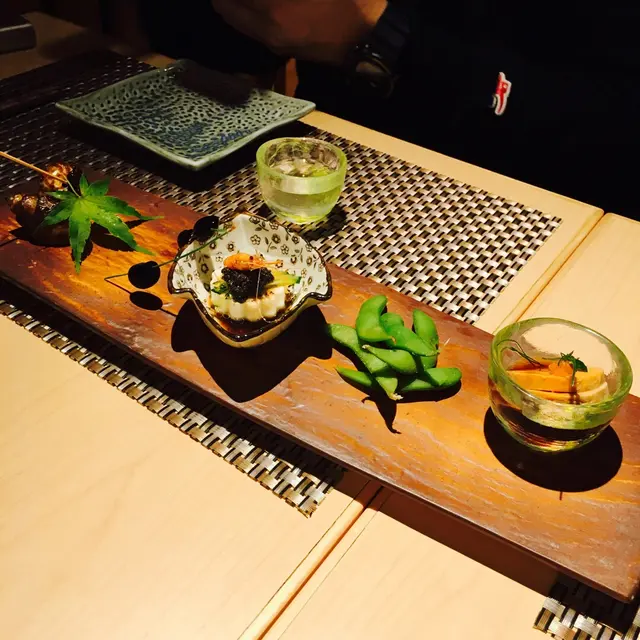 又約左個日本料理達人食飯,又真係帶我食日本菜,今次去左灣仔一座穩世大廈食水木日本料理。呢間日本料理同其他唔同,唔係剩係得刺身壽司,佢仲有好多選擇,有串燒,烤肉等等。我又係得等朋友發辦,坐係到等食。先黎前菜,呢個五小碟樣樣都好好食,好有驚喜,由左至右分別係汁煮東風螺(口感彈牙,醬汁入晒螺肉入面,好野味,連個殻都損埋)、甘露黑豆(黑豆用甘露煮過再雪凍,完全係入晒味,好腍同埋好甜👍🏻)、黑松露豆腐(黑松露味好強,加上櫻花蝦,豆腐同埋青瓜片又有一種清新嘅感覺)、枝豆、鮟鱇魚肝(好少食,口感有少少似熟三文魚,但係就再有多d油份同埋魚味更濃)之後又開左枝sake,老闆話呢枝易入口,濃度冇咁高,係sparkling sake,12% 比起傳統真係少好多,入口都唔會好辣好哽,不過我不勝酒力都係飲左1-2杯就唔得喇。 我真係好鍾意食冰菜沙律,呢到d冰菜再新鮮d, 爽脆清新,好多一粒粒"冰"係上面口感好正,可惜咁大碟得上面係冰菜,多d 就更好。本身見到個加州圈,心諗點解要叫,浪費我個肚嘅quota,但係原來佢入面係有牛油果,牛油果味好香濃,成件事即刻變到唔簡單,好食過平時d 加州圈好多好多好多。再黎係燒特大虎蝦,真係好大隻,佢一開四都每件好多肉,做弓外脆內軟,肉汁仲保留到,蝦味亦都好香濃好特出,個蝦頭仲有好多膏,燒左更香濃好味。竟然係日本料理食羊架真係好似第一次😂燒羊架香口,騷味唔算太強烈,有羊肉應有嘅味道但唔會太騷難入口。加上旁邊嘅醬汁,係mustard嘅味道👍🏻👍🏻👍🏻最後就黎我最愛壽司盛合,呑拿魚真係好好味,入口即溶,咬落去油份出晒黎,成口都係油,好味到我真係嗌左出黎。可以我下次淨係叫呑拿魚😂當然其他都好高質素,海膽軍艦香甜濃厚,帶子亦係XXL,巨大又鮮甜。佢個呑拿魚圈好足料,入面都有魚肉,啖啖肉👍🏻又一間值得推介餐廳,價錢合理食物質素亦一流。…查看更多