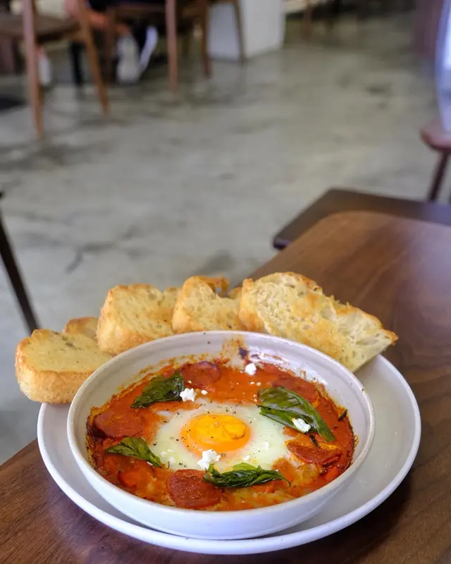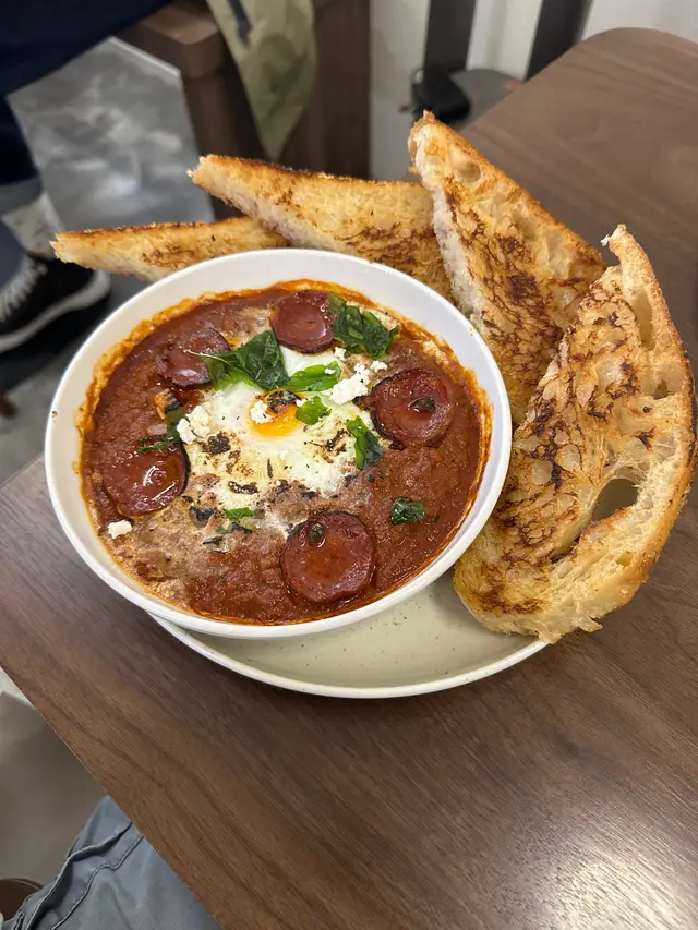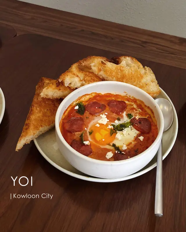 // 北非沙卡蔬卡配意大利香草麵包真係食得出係自家製嘅香草麵包,外皮鬆脆,內裏鬆軟,用嚟伴佢嘅濃郁蕃茄微辣醬,超級惹味!每啖都要用匙羹筆大大啖醬嚟食,點係完全食唔到佢味道。