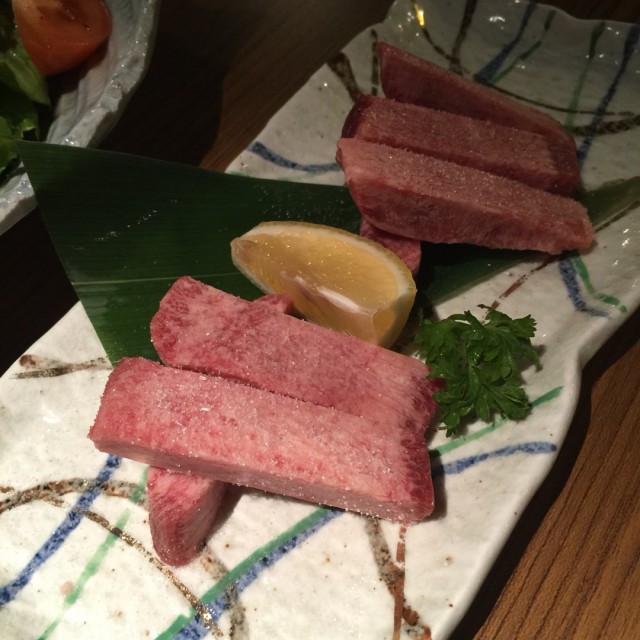 ,色澤似少女粉紅柔膚,比 A4 的又肥美上幾分!我們選擇簡單的鹽燒,以求原汁原味。肉三款,分別是西冷 (Sirloin)、肉眼 (Rib Eye) 和里脊 (Tenderloin),各三件。里脊 (即牛柳) 肉質最嫩,肉眼肉香最盛,西冷肉味最濃,三者各擅勝場。烤炙上等牛肉的話,鹽燒是不二之選。惟有淡淡鹽味方突出肉鮮,汁燒或味噌燒恐蓋過一切 (差點忘了提醒大家,若你沒交代店員,此店的牛肉拼盤一律預設為汁燒)。次序就依個人口味,沒有規定。:)產地牛真箇與眾不同!牛肉一觸網子,眼看著不一刻便告油光泛濫,耳聽著嗞嗞聲響,鼻嗅著腴脂溶化時散發崧子般幽香,實是三重享受