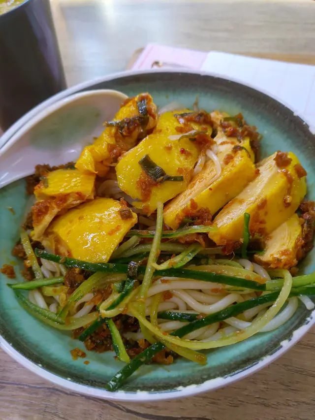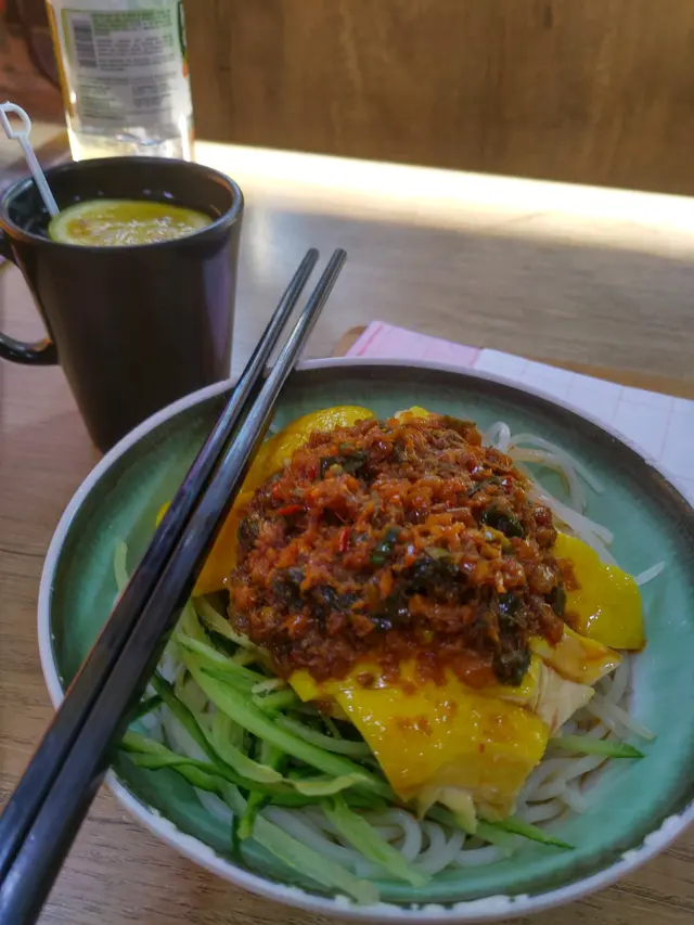 配三種醬,泰式酸辣醬,甜豉油,薑蔥油。口水雞米線$36好抵食,雞有六七件,有青瓜絲墊底,芽菜同米線撈微辣既薑蔥豉油。係海南雞配另一個汁咁。同樣好滑。幾好食,不過