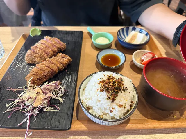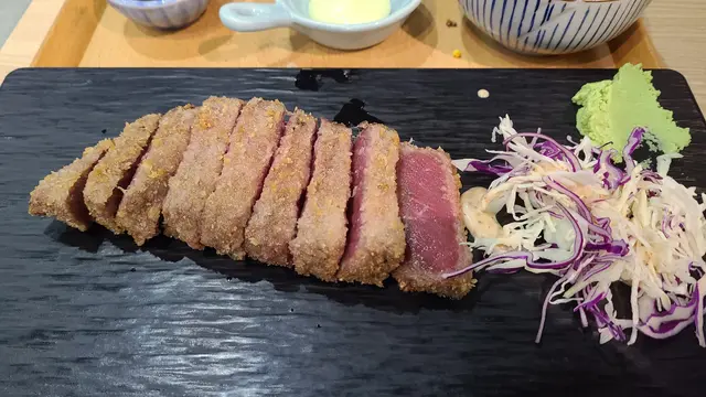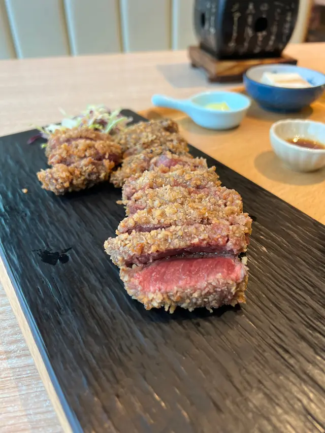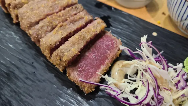 首先黎到既係紫薯latte好淡岩哂唔中意甜既人☺️之後嚟到嘅係抹茶latte相對較濃比較岩抹茶控既我飲🤣再黎就黎重頭既吉列牛套餐,忌廉咖喱烏冬衫衫驚唔夾好奇怪,結果意外地夾最好味又濃又creamy完全係食到停唔到口!黎左個吉列牛我地都係咁不停食烏冬唔理個牛🤣燒個牛配埋飯都係完美組合 唔會好硬岩岩好 重點仲有配菜同麵豉湯 望住出面高樓大廈嘅環境食得好滿足😙…查看更多