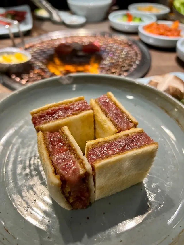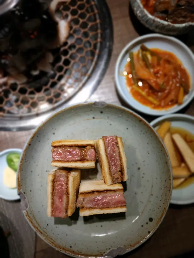 Happy Friday放工同先生撐枱腳,喺T.O.P行咗一圈,見到呢間位於五樓嘅韓式燒肉店,有室外用餐嘅位置,仲有大大棵聖誕樹,氣氛極好,二話不說walk in!食物方面選擇都算多,除咗散叫仲有二人同四至五人套餐,係呢個地段嚟講價錢算係合理。入座後侍應為我哋送上前菜同茶,質素唔錯,我最喜歡佢嘅漬茄子,清新開胃。韓牛肋眼上蓋齋睇賣相已經非常吸引,油花分布均勻,入口牛味香濃,油香滿溢,口感鬆軟,質素非常高!連先生讚口不絕!和牛切成方塊狀燒起上嚟較方便,牛味同樣香濃,但油香就及唔上韓牛肋眼上蓋。豬皮醃得非常入味,燒耐少少至表皮帶有微微嘅焦香,入口即溶,十分滿分!大墨魚非常有份量,原味墨魚身配上醃過嘅墨魚腳,非常吸引。墨魚夠哂厚身,燒到外皮微脆,口感彈牙,香口惹味。和牛三文治賣相精緻,厚切嘅和牛沾上麵包糠炸到大概三成熟,配上香脆嘅多士,口感完美。海鮮豆腐湯配上海苔白飯,份量非常足,豆腐湯熱辣辣送上枱,配上室外微微嘅涼風,特別有氣氛,湯底鮮甜香辣,而且好足料,非常推薦。好耐冇食到質素咁高嘅韓式燒肉,估唔到誤打誤撞搵到呢到,特別係超級加分嘅室外座位,環境舒服,加上大大棵聖誕樹勁有節日氣氛,無論係二人世界抑或係朋友聚會都一流!…查看更多