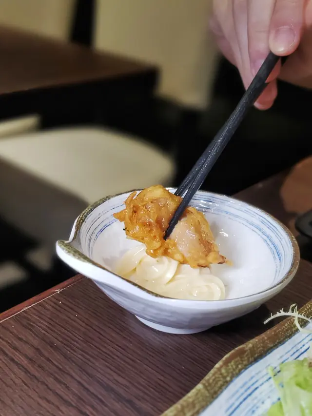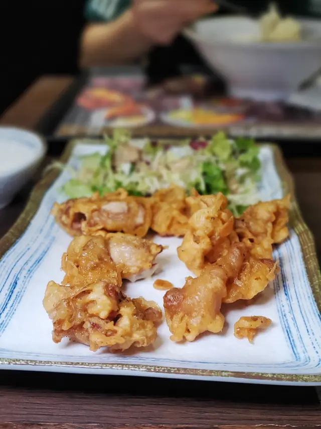 炸雞肉質嫩滑帶汁配麻醬沙律菜,清新不油膩,推薦
