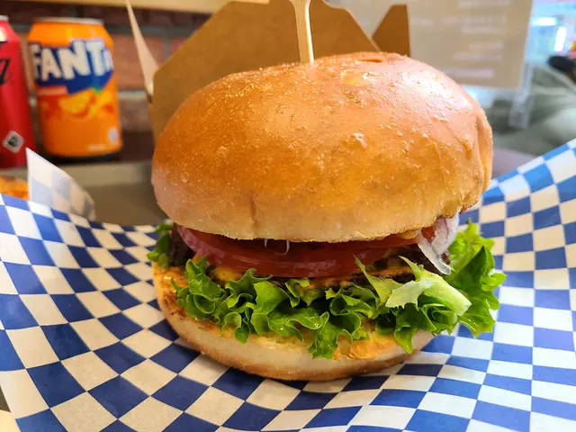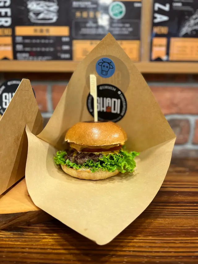 單層安格斯牛堡外觀誘人,麵包酥脆夾著鮮綠生菜、紅潤蕃茄、洋蔥絲、芝士及酸瓜