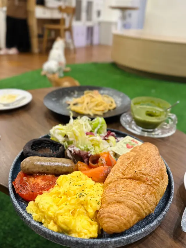 又一間貓貓Cafe🐾係旺角最大嘅一間,有成30隻貓貓有啲貓貓係待領養,每隻都掛住個名牌同樣免入場費同無限時,只設有最低消費呢間冇鞋套,不過要消毒雙手餐廳主要食意粉、小食、沙律,亦有多款咖啡、茶、沙冰、牛奶飲品-▶️ 喵全日早餐 ($128)以為會有貓型吐司,可能冇入貨?成個全日早餐好豐盛:炒蛋、菇、煙三文魚、烤蕃茄、沙律菜、丹麥吐司炒蛋濕潤,冇特別加鹽,只落香草🌿香蛋味煙三文魚兩片,充滿omega-3魚油香味冬菇大粒,咬落juicy烤蕃茄就一般般,味道偏酸🫢香腸特別,外皮爽脆,用上豬肉🐷帶有煙燻同香草味丹麥吐司本身有牛油香味 (似牛角包🥐),咬落酥脆,旁邊有牛油但個人覺得唔使搽已經夠香沙律菜配上適當份量嘅沙律醬🥗感覺健康 (連貓貓都偷食😆)▶️ 招牌蒜香蟹肉明太子闊條麵 ($128)差唔多個個都叫呢款意粉麵質做得幾好👍🏻al dente闊條麵特質係面積夠大,可以黏住醬汁明太子醬好creamy,有幾分似帶鮮味嘅carbonara醬入面仲有唔少真蟹肉🦀唯一係濃味咗少少🤏🏻會漏啲旁邊嗰兩個貓掌腳印真係好可愛😻▶️ Matcha latte (H: $48)面頭灑上貓掌形狀嘅抹茶粉🐾好打卡-able攪勻之前可見有三層,兩層抹茶粉夾住牛奶抹茶味道顯然濃厚🍵不過選用嘅抹茶粉本身偏甜,唔係一般甘苦嘅味道-食物款式唔算多,簡簡單單但味道唔錯,唯一係分量偏細咗少少鍾意佢賣相擺盤得意,有貓掌裝飾影相出嚟都靚啲🐾內在以青青草原為題,有picnic同大自然嘅感覺🌱feel到啲貓貓好鍾意成間舖好大好空曠,我哋好好彩揀到窗口Tatami座位坐,望旺角街景之餘又可以近距離同貓貓接觸☺️成個設計都好貓-friendly: 牆有窿可以俾貓貓捐過,有跑步機俾貓貓做運動,仲有唔少俾貓貓跳上跳落嘅位置呢度啲貓貓係我起咁多間貓Cafe入邊見過最活潑最親人嘅🐈會主動走埋嚟坐喺你隔籬,有啲仲會坐上大髀,任影唔嬲睇得出店主好錫佢哋,逐隻餵食藥同罐頭,所以貓貓算乾淨,甩毛唔多店主服務都好好,好有禮貌,親力親為💁🏻♀️好媽媽feel價錢合理,大概$170/人,連加一,當Cafe 坐又可以玩貓貓🐈⬛加上呢啲貓cafe好需要資金去維持🥹壓力大想減下壓,黎玩貓貓都係一個選擇!(平日晏晝唔算太過多人,不過大家可以事前book定位)…查看更多