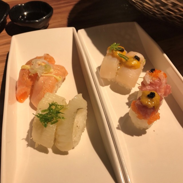 手卷:海膽和辣味鳗魚手卷,不錯。:)卷物:牛油果軟殼蟹卷和辣汁炸蝦卷,不錯。:) 鐵板料理:鐵板牛柳粒過熟有D靭及鞋、泡菜炒豚肉微辣中帶甜味,味道就一般啦!:)創作料理:吞拿魚他他一般、章紅魚薄切拌柚子酢不錯,味帶鹹鹹地酸酸地挺開胃、水晶香芒大蝦卷都0K,我覺得款式似泰、越式食品。