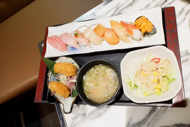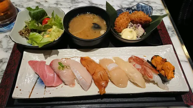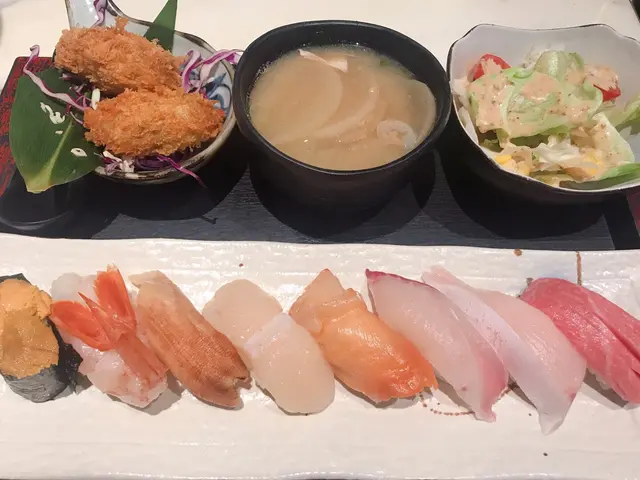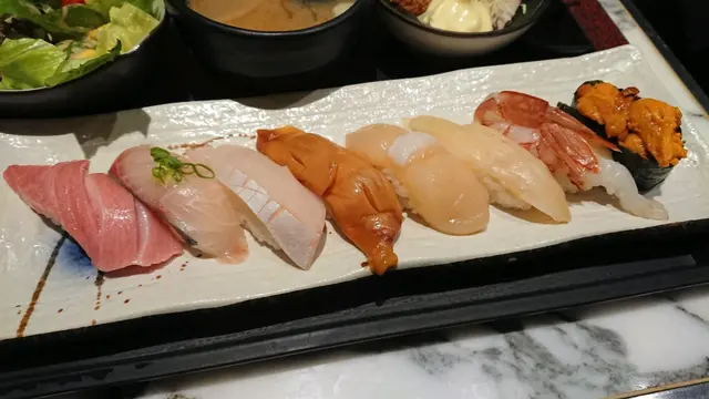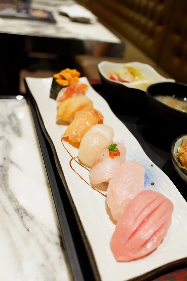 一直來這裡吃午餐,今天約了朋友吃晚餐,一邊聊天,一邊享用日本料理。這裡的刺身包羅萬有,部分部分更是新鮮直送,所以一定要試一試。⭐️北海道海膽刺身50g$198一瓣瓣海膽入口香味濃郁,清甜爽口。海膽新鮮沒有腥味,在口中𣊬間融化像冰淇淋一樣,配搭紫菜飯糰簡直將海膽發揮極致,增加口感,令海膽更美味不單調。⭐️大名壽司定食$268🔸日替湯品 三文魚頭湯,魚味鮮甜,沒有腥味。三文魚頭營養價值高,湯中的魚肉脂肪含量低,蛋白質豐富,健康又美味。🔸田園沙律芝麻醬沙律,清爽可口。🔸壽司8貫分別是大本鮪魚腩、築地鮮魚、日本帆立貝、赤貝、油金魚腩、特大赤海蝦、日本象拔蚌、海膽。各類海鮮刺身和壽司飯比例恰到好處,鮮甜美味。我最喜歡大本鮪魚腩壽司,魚脂充沛,魚味突出,很棒喔!🔸吉列廣島蠔外脆內軟,粉漿炸至金黃色,入口不會太油膩,略帶蠔味。…查看更多