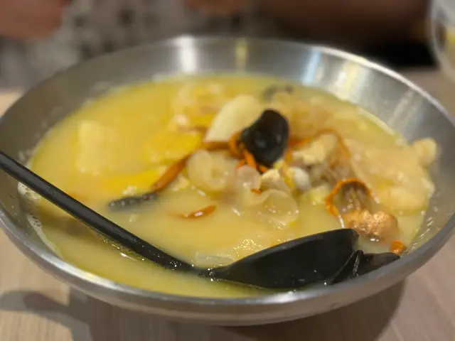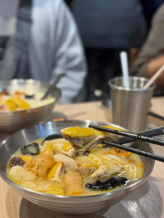 呢間餐廳主打以三黃雞熬成嘅花膠雞米線🐥另外亦有其他款式嘅雞湯米線、花甲粉、擔擔麵、小食等,係觀塘區內一間排隊名店🤩💗姬松茸竹笙花膠雞米線 ($78)湯底以三黃雞,豬筒骨,鯊魚軟骨同西施骨熬煮3個鐘,湯色金黃,味道鮮味濃郁,飲完都唔會口渴🦴雞件選用三黃雞,雞皮爽彈同時雞肉嫩滑🐓花膠則選用鱈魚膠,口感滑嫩爽彈;配上爽滑嘅米線,再加上姫松茸、竹笙、雲耳同蟲草花,更滋補養生🍜💗椰子花甲粉 ($58)花甲粉湯底用上鮮雞湯,再加入椰汁同椰子肉煮成,湯汁呈奶白色,有陣陣椰奶香味🥥沙白蜆份量多,粒粒都鮮甜飽滿,最緊要係無沙🐚配上爽滑嘅粉絲,再加上娃娃菜、雲耳、金菇菜同青瓜作配料🥒💗燒豬頸肉 ($58)豬頸肉表面焦香,不過略嫌燒得過咗火,肉質有少少乾🐖…Read More