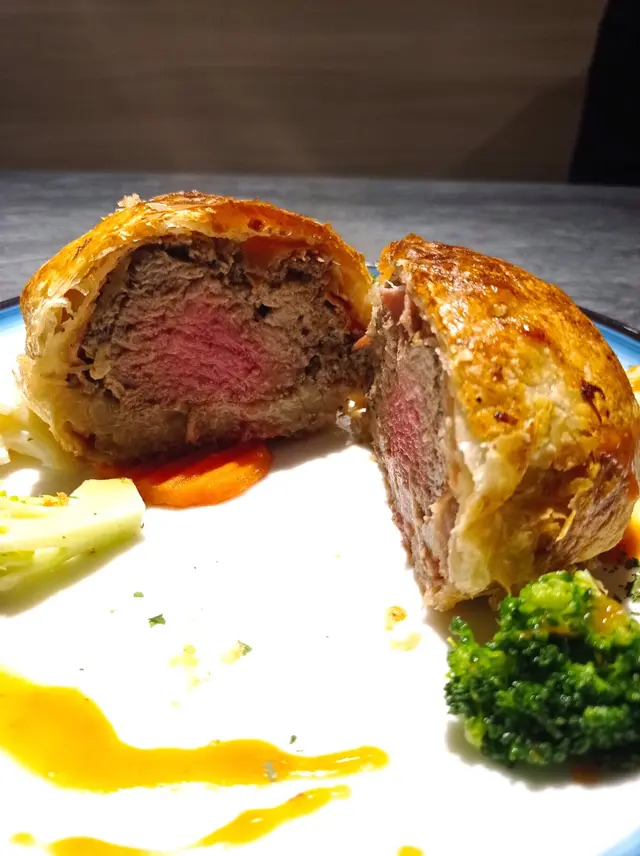 我和友人再次來到了北角和富中心吃晚餐,今次去一家港式茶記,冰室99。雖說是港式茶記,但是他的食物種類相當豐富:有富東南亞特色的咖哩農夫包、西式的意粉、鐵板扒類等等,看起來都頗吸引。連飲品的部分也有相當之多選擇,那當然要一試特色飲品啦!先來港式特飲雪糕紅豆冰,香滑的雲呢拿雪糕跟飲品可以互相融合,配上底部香甜起沙的紅豆,非常有懷舊風味。朋友選擇雜果賓治,梳打水底配合雜果,感覺清新也不會過甜。我們點了一份扒餐和一份咖哩農夫包,套餐附贈多士和餐湯。南瓜粟米湯非常濃郁足料,能吃得到滿滿的南瓜蓉和粟米粒。多士更加有驚喜,充滿著牛油香。中心的部分就如牛角包的千層感覺。先來充滿馬拉風味的咖哩或雞配農夫包。農夫包內裝滿奶香的咖哩,旁邊還有芝麻醬沙律來平衡一下。他們用的是雞件,肉的質感柔滑,還有邪惡的拉絲芝士呢!整個農夫包都烘得非常香脆,一邊咬一邊會掉碎。香濃的咖哩汁跟農夫包一起吃,酥香又惹味。另一道主菜是我非常期待的威靈頓牛柳配蒜蓉汁及珍珠米。一直覺得威靈頓牛柳的做法很特別,在牛柳上鋪酥皮是為何呢?一次開就知道龍與鳳了。最頂的酥皮層充滿著牛油香,然後緊貼酥皮的是一層薄薄的風乾火腿,就是它帶來了整個鹹香的感覺。最中心的部分當然是靈魂:牛柳啦!肉汁能充分地被保存,咬下去肉汁爆滿,肉質也相當柔軟,十分有驚喜。這樣豐富的晚餐又牛又雞,每人都只是150元左右,性比價高,值得再來嚐其他菜式!…查看更多