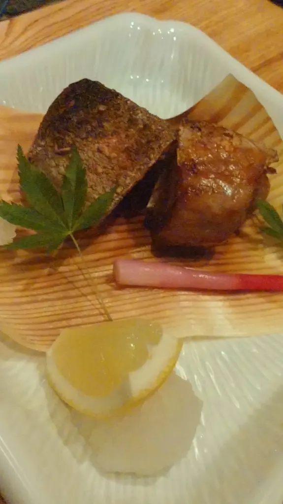 ,油香油脂均勻,香而不膩,齒夾留香。間八、深海池魚等,也較昂貴,坊間較少吃到,最重要是件件厚切,大大件放入口,好滿足!!季節清湯:山瑞湯山瑞即類似水魚,山瑞都較矜貴。主要湯料有年糕片、大蔥及山瑞肉,吃下去山瑞本身沒有太突出的味道,好像咬了滿口骨膠原,含豐富蛋白質及膠質, 好養顏。日本鹿兒島A5和牛薄燒