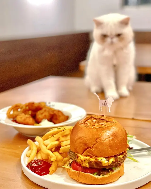 各位貓貓控入黎🐈唔洗入場費‼️旺角最大貓貓Cafe✨性價比高好旺場~Dinner二人套餐買單先$298🤩!!重點係🌟食物質素完全媲美西餐廳👍🏻🧚🏻♀️~~~~~~~~~~~~~~~~~~~~~~~~🧚🏻♀️🟢 —— Salad & Soup沙律菜新鮮爽口, 搭配芝麻醬好fresh南瓜湯有驚喜🌟真材實料食到南瓜蓉!!濃郁忌廉中帶點南瓜甜, 奶香十足~🟢 —— Linguine Carbonara with Hot Spring Egg必食!! 極高質⚠️超濃郁奶香卡邦尼‼️扁意粉口感彈牙, 啱啱好Al dente拌勻流心溫泉蛋, 加埋洋蔥煙肉嘅鹹香每條意粉裹滿濃稠醬汁💯Creamy又唔膩~🟢 —— Angus Beef Burger with Fries安格斯牛肉手工漢堡🍔食肉獸認住佢!!熱烘麵包軟熟, 整體肉汁飽滿唔dry安格斯漢堡扒💦牛味濃郁充滿油脂香~搭配芝士番茄生菜等, 層次豐富伴碟薯條超香脆, 份量好足🟢 —— Snacks Platter | Chicken Karaages, Fries, Onion Rings餐廳炸物相當出色, 一份三重滿足🔥熱辣辣上枱香噴噴, 凍咗依然酥脆唐揚炸雞外脆內嫩, 洋蔥圈惹味香口🟢 —— Passion Fruit Honey | Apple Vinegar Lychee Soda兩款梳打都係酸酸甜甜幾清爽🍹水果味道天然, 叫咗少甜啱啱好~……………… 🟢 —— 店鋪環境 環境非常寬敞, 乾淨衛生舒適✅全場超過40隻貓貓!! 全部都好得意活潑!!有啲仲想靜雞雞過黎偷食🤫…大家想體驗比貓貓包圍可以加購貓零食~