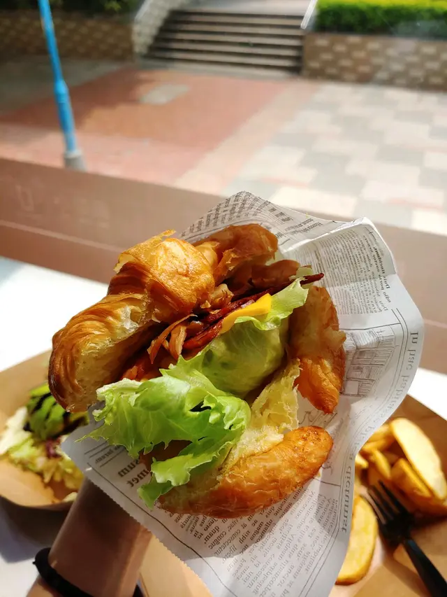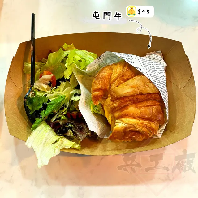 數數手指已經是第3次來訪「小茶角」。上兩次堂食都是晚間時段,今次難得中午過來,當然要坐在窗邊位,可以欣賞到藍天白雲的屯門碼頭,心情倍感暢快。煙三文牛夾了煙三文魚、蕃茄片和生菜。牛角包入口鬆軟,充滿牛油香。配上煙三文魚的燻香、蕃茄和生菜的清新,即使吃罷整個牛角包也不會覺得太膩太heavy。屯門牛則分別有蛋、蘑菇、芝士、煙肉、蕃茄,和生菜。輕微烘過的牛角包下,芝士夾在煎香的煙肉和蘑菇中呈微熔狀態。雞蛋滑溜有蛋香,蛋汁和麵包內的千島醬融合,味道豐富。四季春茶底清香帶甘,而芒果冰冰入口重芒果香味,是一杯非常適合夏天的飲品。而他們的芝士奶蓋就較為偏甜。飲品整體上就屬於不過不失。點一個牛角包和一杯飲品,更會附送薯條/薯角/沙律,自動升級為套餐,份量也頗多。套餐以外,還多點了一樣小食 雞翼炸香,新鮮熱辣上枱,吃時燙口。咬開juicy惹味,還有少許椒鹽味。另外也配了蟹籽沙律醬蘸點,點後會多了一份甜味。…查看更多