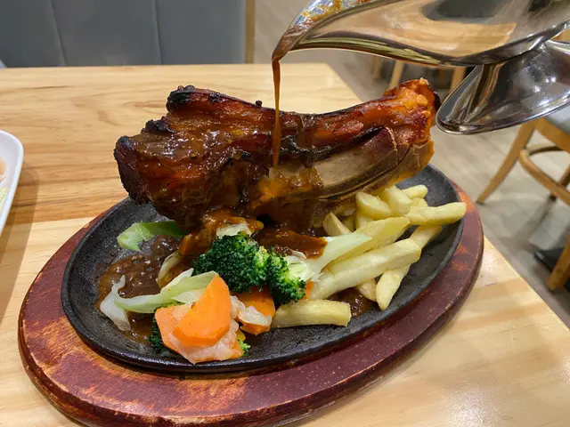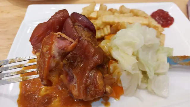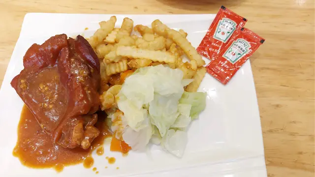 「茶豆冰室」啱我心目中的要求,就入去醫肚先😉午餐、下午茶款式有好多選擇午餐包個餐湯(羅宋湯),雜菜幾多,最緊要係個湯又夠熱德國咸豬手配薯菜 $57中午有得食「德國咸豬手」的地方真係好少有