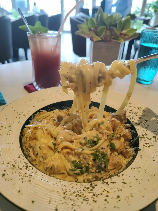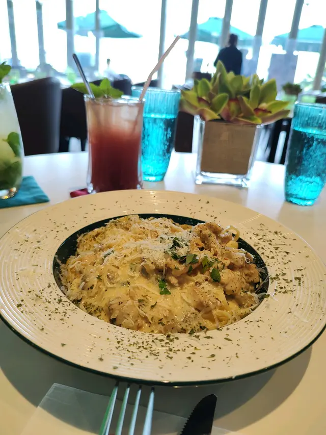 朋友住馬灣,星期六請我入去行下,喺荃灣搭船入去,十零分鐘船就到都幾舒服,到咗馬灣之後,感覺空氣好咗,人少咗,周圍都好似闊落咗。朋友再介紹我哋去食個早啲晚餐,間餐廳門外面對正青馬大橋,一望出去就有個全馬景,超正!雖然我地坐於餐廳裏面,但喺望出出面都好似歐洲一樣,而外面都重有幾張枱可以畀人坐,完全有去咗歐洲嘅感覺,我哋當然就要點返兩杯雞尾酒飲下啦!我就點咗Mojito 而朋友就點咗 Respberry Garden, 跟住點了個2 in 1 Double Happiness Pizza, 可以將印度香料烤雞和夏威夷薄餅各一半,之後加起嚟變一個大簿餅;再加個忌廉雞肉闊條麵;話咁快兩杯雞尾酒就嚟到喇,碧綠晶瑩的mojito和紅粉緋緋的Respberry Garden跟這裏的環境氣氛相映成趣!飲落Mojito嘅冧酒加薄荷青檸,更加令人醒神,而Respberry 的濃郁就好有歐洲味道!轉眼忌廉雞肉闊條麵亦都嚟到,闊條麵彈牙,極有人手即製嘅感覺,每條麵都掛上濃郁嘅芝士和蘑菇汁醬,美味無窮;跟住個大的pizza亦都出現喺枱面呀,是我最鍾意食的薄pizza,餡料一半辣一半唔辣實在係絕配!印度烤雞薄餅哪一半辣味十足,餅脆雞肉嫩滑,畀人一種刺激嘅感覺,而夏威夷薄餅那邊,菠蘿加煙肉再加上濃郁嘅芝士味,每塊都有拉絲嘅感覺實在回味無窮。在這餐廳飲著雞尾酒,食著意大利薄餅,真係有一種去咗歐洲嘅感覺。再加上服務員超好嘅服務,這餐真係完美!…查看更多