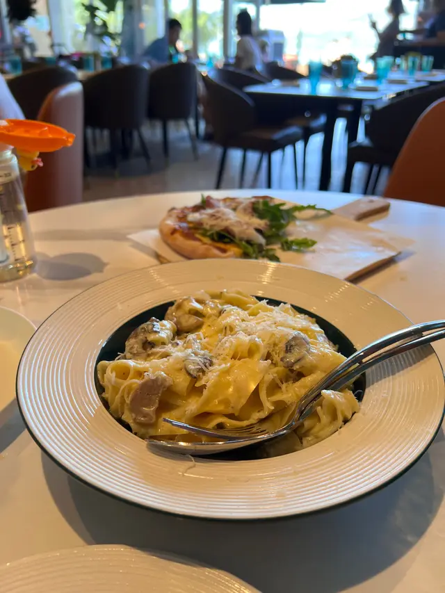 今日同小朋友去馬灣沙灘,出發前梗係醫好個肚先。在餐廳門口,已經俾佢海天一色嘅景致吸引咗。餐廳對正个海,遠眺青馬大橋,青山綠水,心情豁然開朗。侍應見到小朋友,立即送上兒童餐具,非常細心。Pama ham pizza (m) $118Pizza 每日新鮮製造,醬汁是自家製造,別有一番風味。Pizza熱辣辣,芝士厚厚地密鋪在整個Pizza上,不停拉絲,每啖都是濃郁的芝士味。餅皮鬆軟,芝士烤得焦黃香甜,配上翠綠的火箭菜,令口腔fresh 起來。雞肉蘑菇闊條麵 $108這裏的芝士毫不吝嗇,芝士配上奶油,軟嫩奶香。濃淡適中,很適合俾小朋友。好足料,香菇味十足,加少少Tabasco最正。Mango slush $68綿滑的芒果沙冰和這個藍天白雲,簡直絕配,恍如置身峇里一樣的感覺。呢度仲有叉電位,飲嘢耐啲,玩吓電話都唔驚冇電,又一細心位…查看更多